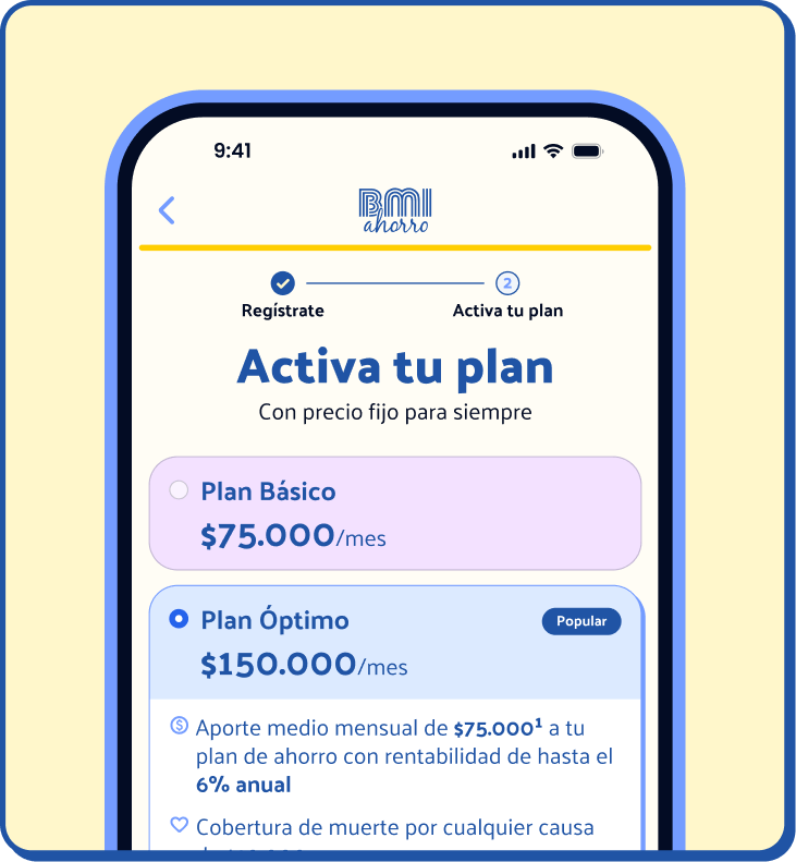BMI Ahorro un es un seguro de vida más plan de ahorro 100% digital de BMI Colombia Compañía de Seguros de Vida S.A, entidad vigilada por la Superintendencia Financiera de Colombia, con solidez financiera como subsidiaria de BMI Financial Group.